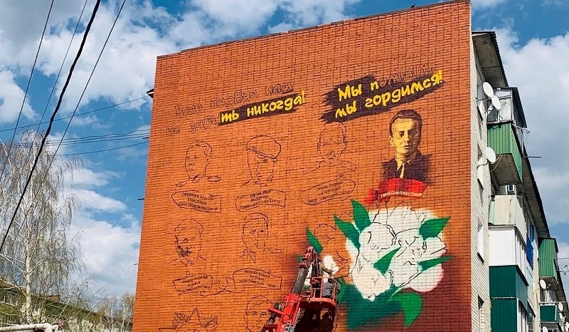 Дом №32 по улице Мира в городе Инза Ульяновской области скоро станет местной достопримечательностью. На торце этого дома, самой обыкновенной пятиэтажки появляются портреты героев Великой Отечественной войны. Художники наносят рисунки, используя аэрографию.